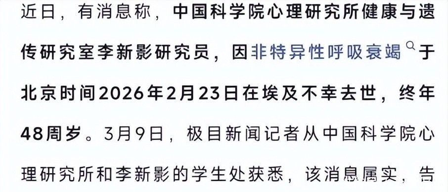 2026日,一条沉痛通报瞬间席卷各大社交平台——中国科学院心理研究岁的博士生导师李新影,在埃及执行学术任务期间不幸辞世,官方消息正式发布。